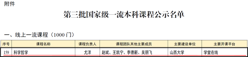 8月21日,教育部网站发布了《关于第三批国家级一流本科课程认定结果的公示》。公司尤洋教授团队申报的《科学哲学》入选第三批国家级一流本科课程(线上一流课程)。该课程于2019年正式上线学堂在线,至今已完整运行7年,线上授课13个班级。2021年该课程被认定为山西省一流课程,是FUN88乐天使哲学专业核心课程之一。尤洋为该课程负责人,授课团队包括赵斌、王凯宁、李德新、吴朋飞、康仕慧、杨维恒、王亚男、何华。