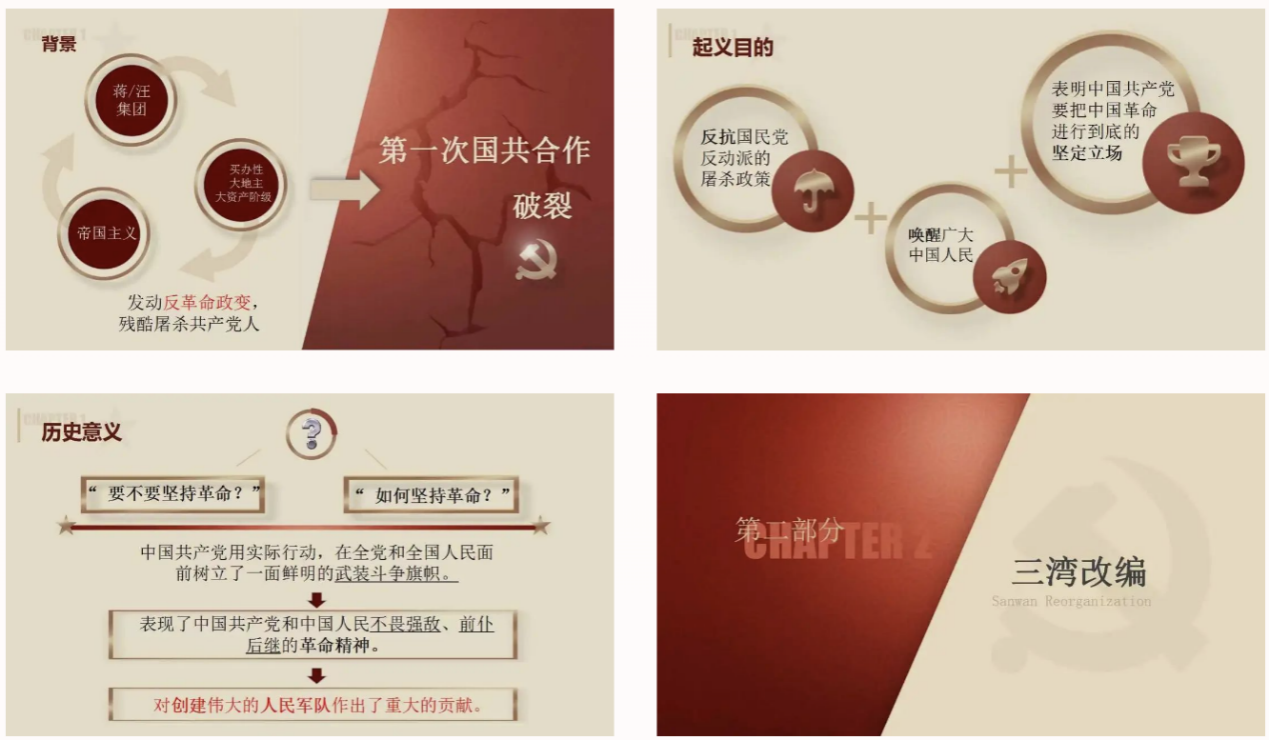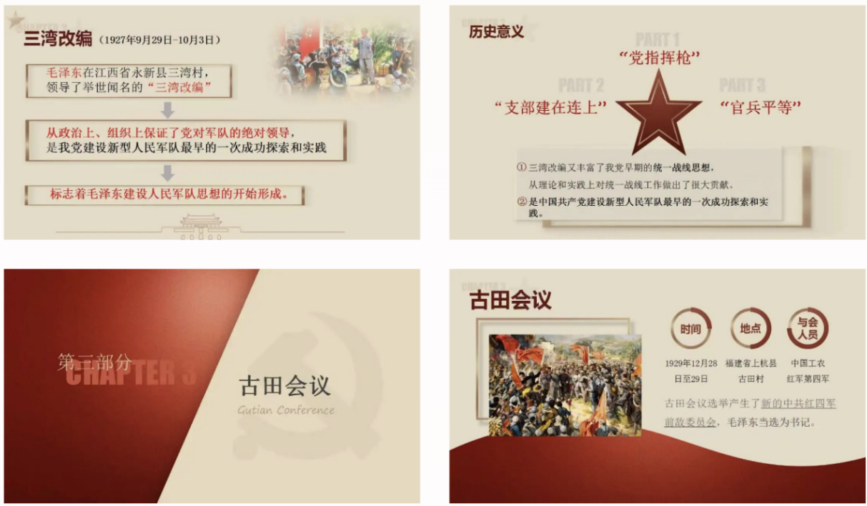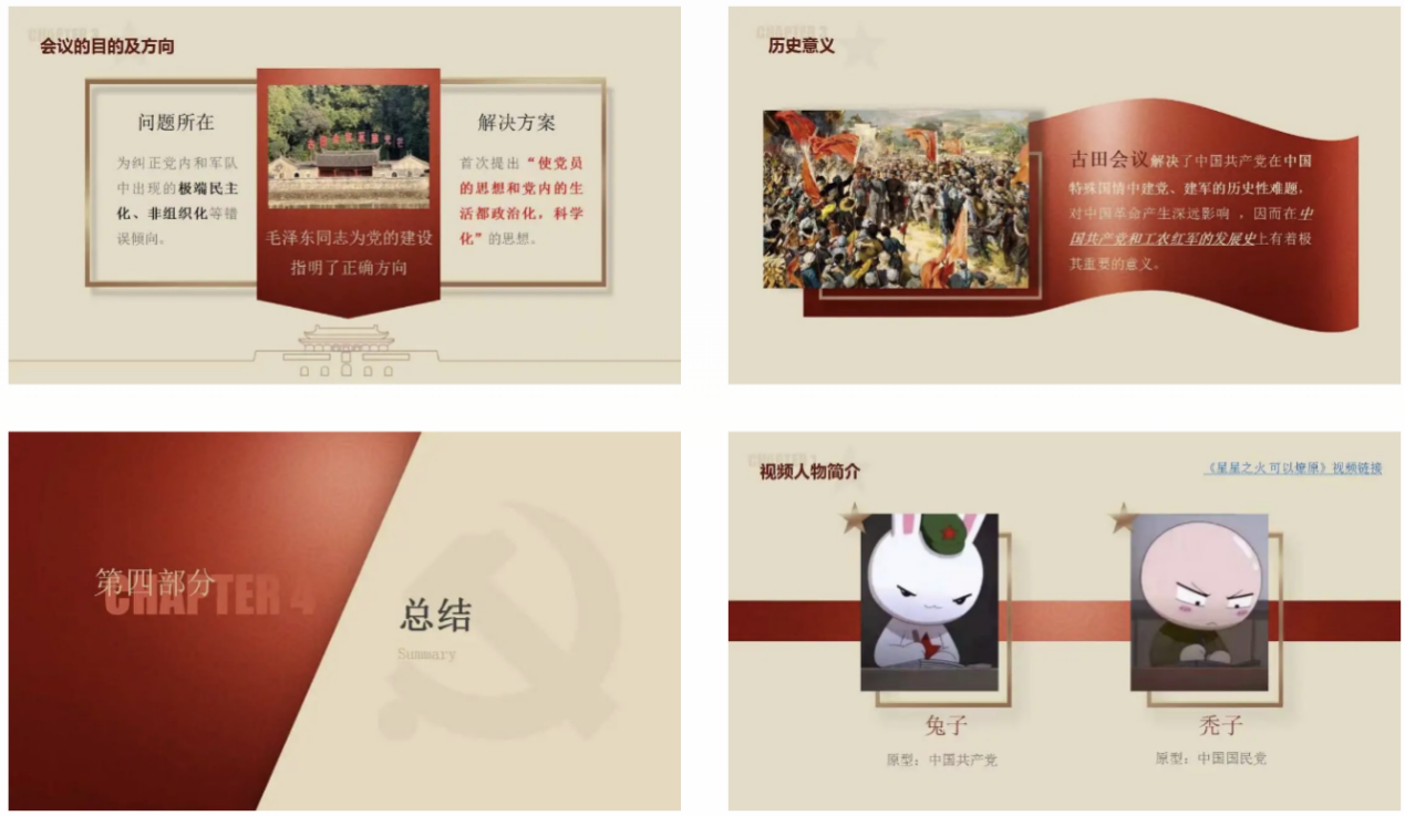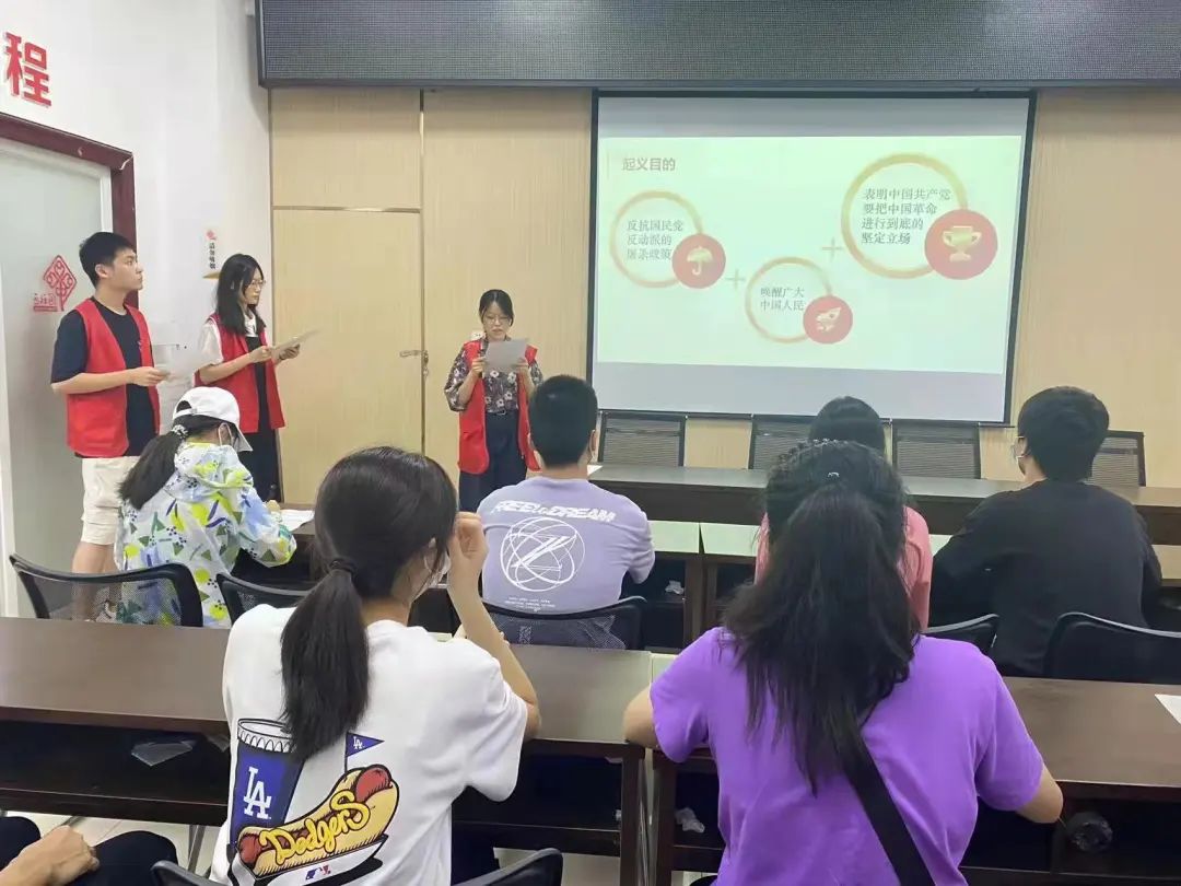 我们的宣讲是理论讲解与动漫视频的相辅相成,而不是生硬结合:先对三个事件的背景、内容、意义等进行较为详细的讲述,再在总结部分播放视频,以更具趣味性、生动性的形式重选历史;最后,将三个事件进行串联总结,并有意识地呼应视频内容,进一步增进理解。同学们在宣讲过程中聚精会神、积极配合,给了我们很大鼓舞。如果说宣讲的内容准备是我“内化于心”学习过程,那么宣讲的举办则是“外化于行”的实践过程,希望通过宣传教育帮助青少年“学党史,强信念”,追寻红色记忆,传承红色精神。