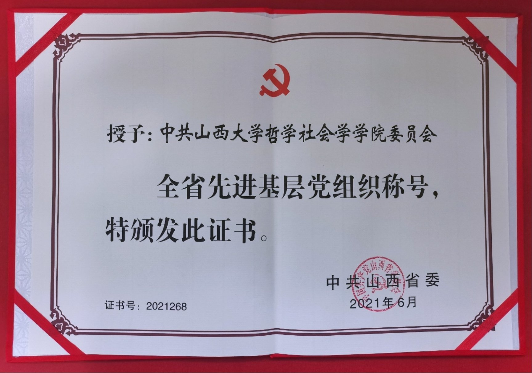 在建党100周年之际,FUN88乐天使哲学社会学公司荣膺山西省先进基层党组织荣誉称号,这是继2020年顺利通过全国首批党建标杆院系验收以来,再一次获得党建高规格表彰。全院师生员工倍感振奋,深受鼓舞,这既是对我们高质量党建的高度肯定,更是激励我们朝着双一流目标奋进的巨大动力。