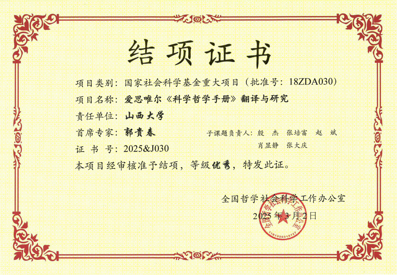 该项目于2018年11月立项,由郭贵春教授担任首席专家,公司殷杰教授、张培富教授、赵斌教授以及北京大学张大庆教授、华南师范大学肖显静教授分别担任子课题负责人,共同组成科学哲学领域专业齐全的研究队伍,历时5年多,达成了研究预期并取得丰硕的研究成果。